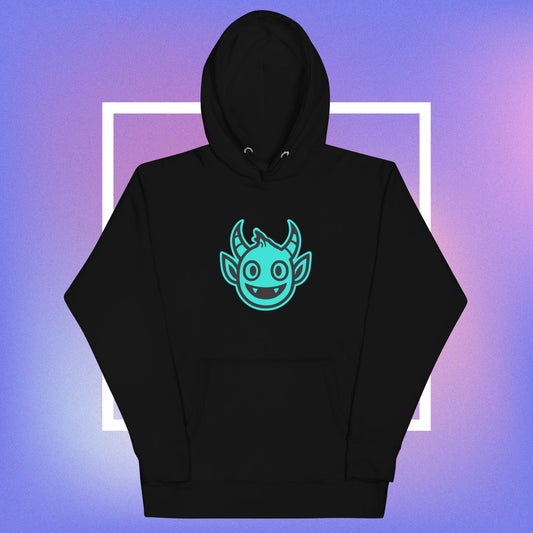 Maya Hates Me Unisex Hoodie- in Dark Mode. Purple Black and debug dungeons signature moody blue.