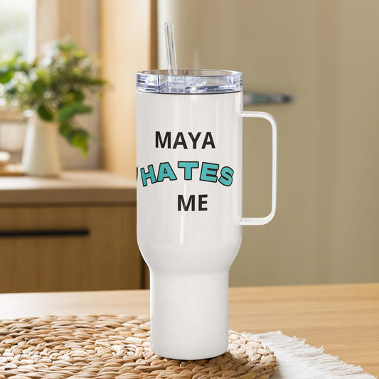 Debug Dungeon, "Maya Hates Me" Customizable Travel mug with a handle. What software hates you?